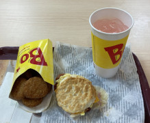 Finally made it to Southport, but got here so late that we didn't feel like going any further than the hotel area.  So, we ended up at a Bojangles again -- at least it's a North Carolina original.  We walked across the street and realized along the way that the outside lights had been turned off, even though it was only 9 PM and they were supposed to be open for dine-in until 10 PM.  Since the inside lights were on full blast, we tried the door and to our surprise, it was unlocked, so we went in and spoke with the nice lady at the counter.   Well, they were out of chicken – imagine that, a chicken restaurant that's out of chicken!  Honestly, this isn't the first time we've run into this: I think they only prep a certain amount of chicken each day and don't have the capacity to prep more in the evening if they should get slammed and run out.  But, they were able to make us a bacon-egg-and-cheese biscuit and gave us a large fry box full of Bo-Rounds, so we were well fed.  The really amusing part was that as we sat and ate, a Domino's delivery driver showed up and brought the staff two pizzas! (Q: Were they BBQ chicken pizzas?)  I guess that's what you do when you run out of chicken at a chicken place.  Even stranger, the guy went out to his car and came back in wearing a really nice gray cat mascot head and gloves.  I wish I could have heard the conversation with the two staff members, as I was really curious as to what that was all about – the staff seemed to know the guy pretty well, so I'm guessing this is far from the first time they've ended the work day with pizza.