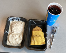 Wanting to get back into our North Carolina cuisine journey, and learning from past mistakes, we started the day at Biscuitville for a good brunch.  This is a chain restaurant, only open for breakfasts and lunches, but it has its roots in Burlington, North Carolina and its headquarters are now in Greensboro.  One of their store features is the "Biscuit Window" where you can watch as the biscuits are being made each day.  My companion got a sausage and gravy biscuit and I nibbled on his hashbrown.  I tried to convince him to get a nice, healthy orange juice, but he spotted Cheerwine on the fountain and this was the first opportunity he'd had to get fountain Cheerwine the whole trip (he is sensible enough not to drink that kind of caffeine in the evenings, yet the only time we seemed to find Cheerwine on a fountain was in the evenings until now).  I at least made him stop at one 21 ounce cup.  Overall, not a bad place, other than the TV set blaring the news at a level where you couldn't get away from the sound no matter what corner of the restaurant you retreated into.