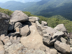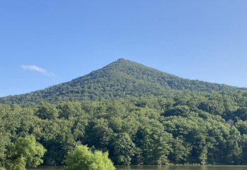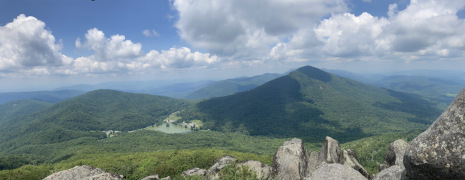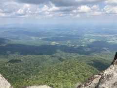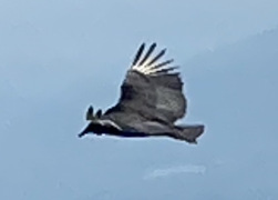 My companion was crazy brave enough to try visiting a second mountain peak today, though he had the good sense to ride the shuttle to the top and simply hike back down.  He said there were some really nice views, but not quite as nice as on Flat Top peak.  He's happy to report that he's now been to the top of all three peaks (Flat Top, Sharp Top, and Harkening Hill), and has hiked up (and back down) Flat Top and Harkening Hill.  Even so, he's looking forward to the next time he can get to Peaks of Otter, as it's a great place for a relaxing vacation, even over a holiday weekend.  FYI, the panoramic picture shows Harkening Hill on the left and Flat Top Peak on the right, the Peaks of Otter lodge and Abbot Lake in between the two.  The last picture is of a black vulture, which was captured while it was flying – as pixelated as it is, it's still a rarity to get that good a shot with an ordinary smartphone.