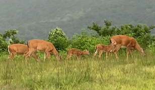 While this entire section of the parkway is still open, it's kind of a desolate place, especially on a rainy day.  The main attractions along here are three picnic areas (Smart View, Rocky Knob, Groundhog Mountain) and the famous Mabry Mill.  The odd thing is that we've been by the Mabry Mill three times over the years and have never seen more than a handful of people there, and we've never seen the restaurant open.  I don't know if it only opens for the spring and fall, or if it's just closed for good.  The big problem right now is that they've shut down all of the restrooms along this stretch.  The ones at the Rocky Knob visitor's center might still be open, but we got there after 5 PM, so the center itself was closed.  All of the other restroom buildings at all four locations had signs reading "No Bathrooms Available" along with locked doors.  Only Mabry Mill had portable toilets, which is appreciated, but they need signs at the other three locations to point you to Mabry Mill for restrooms.  All that said, the Rocky Knob and Smart View picnic areas are just plain awkward: huge, hard to navigate with lots of one-way lanes, and just not well maintained, thus hardly anyone seems to use them, making them a bit creepy.  They'd probably do well to close both completely and maybe build another small picnic area like Groundhog Mountain: something easy to see and access and with a lot fewer picnic spaces, since it seems like people just don't picnic like they did in past decades.  With the rain, we didn't get many pictures along this section, but we did get to see three mother deer with two fawns, one of them the liveliest thing I've ever seen.  That made the short hike in the rain more than worth it.  Interestingly, on the way back from seeing the deer, we spotted a three-foot long snake crossing the road.  We didn't get a picture, but it was interesting to see something like that: contrary to popular belief, most snakes stay out of sight and don't want to hurt people.  Most snake bites come from people disturbing them accidentally (or unnecessarily) and then, as you'd expect, they're going to defend themselves.