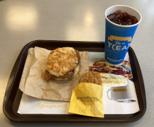 There's a Biscuitville right across the parking lot from our hotel, making for a nice, quick brunch.  My companion tried the spicy chicken and honey biscuit this time, which he said was quite good: not too spicy, and the honey helps balance it all out.  I enjoyed eating his hashbrown, and I tried a few sips of that Cheerwine he loves so much – it's acutally pretty good.