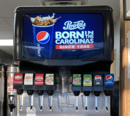 And now, a special shout-out to Pepsi.  If you're outside of North Carolina, you might be completely unaware that Pepsi AKA Pepsi-Cola had its origins in this state, specifically in the coastal town of New Bern.  Outside of this state, you'll see standard generic brand advertising, but throughout North Carolina you'll see advertising like in the picture on the right: "Pepsi-Cola: Born in the Carolinas".  With apologies to a certain Georgia based cola, my companion and I have always liked RC Cola, but given the limited availability of RC, our next favorite is Pepsi.  So, it's nice to find so many places selling Pepsi, and nice to see them celebrating their local heritage.  We've been doing our part to occasionally get Pepsi when Cheerwine isn't available.  However, given that the North Carolina Pepsi bottling companies also bottle Cheerwine, Pepsi tends to be wherever we find Cheerwine, and we tend to lean towards Cheerwine, or being the southern folks we are, a good sweet iced tea.