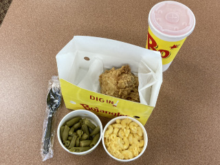 Had another dinner at Bojangles.  This location was not quite as nice as the other two we visited in past weeks, but the service was friendly and the food as you would expect.  My companion just wasn't all that hungry and wanted something simple, so he got a two-piece dinner with green beans and mac-and-cheese.  Nothing to write home about, but since we're doing a North Carolina culinary blog, I'll document it nonetheless.  Interestingly, we noticed that they're now offering "Bird Dogs": imagine a hot dog bun with a large chicken finger in it with appropriate sauce on it and a couple of pickle slices.  And here I thought I'd already seen everything imaginable …