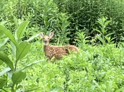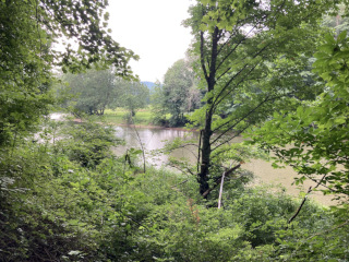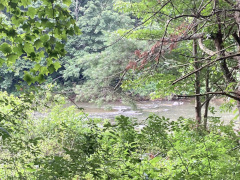 Not much to report on the culinary scene today, as we traveled from Mount Airy to Boone, spending most of the day at the New River State Park for some quiet R&R.  We bought a sandwich along the way and had a picnic there, though my companion forgot to buy a cold drink and we didn't have any cold ones with us, so we had to make do with water.  As it was, my companion was a little under the weather, which was appropriate given the rain off and on during the day, so he didn't do any difficult hiking.  However, at one point he walked the River Run trail, which as the name implies runs beside the New River and is pretty flat.  On the way back, we sat on a bench for about fifteen minutes, and out of the blue a deer fawn appeared in the tall grass near the path, staring at us from a couple of places, but never coming any closer before running off.  Most of the time, though, we sat on the wonderfully large back porch of the visitor's center.  He wants to do a waterfall hike on Friday early afternoon, and he's trying to build his energy back up before then if he can.  Fun side note: if you remember the old "Home Improvement" TV series, there was the neighbor Wilson, who's mouth they always hid behind something.  It started as an accidental fluke, and once realized, they decided to keep it up the rest of the series.  I always think about that when we go through this part of North Carolina, as there's a small town listed on signs as "Mouth of Wilson" – I guess we know now where his mouth disappeared to!