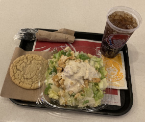 Another night where my companion just wanted something simple and quick, so we walked across the street to a pretty nice Wendy's.  He ended up getting a chicken caesar salad and a sugar cookie, and says it's nice that they have regular caesar dressing once again – for some period of time they'd replaced it with some kind of lemon caesar, which he never cared for at all.