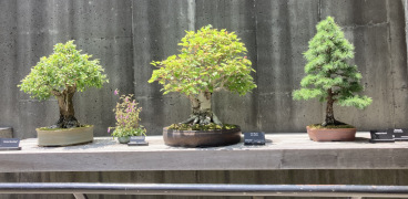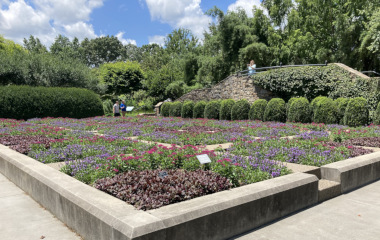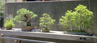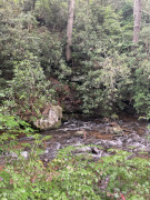 We were supposed to meet up with some of the other attendees of the IT conference to hike at the Arboretum, but my companion was kind of worn out after the conference and his hike at Catawba Falls the previous day, so he didn't get away from the hotel in time to meet the group, but still spent the afternoon at the Arboretum.  In short, this place is a large gardens, loosely similar to Callaway Gardens in south western Georgia.  The Arboretum has the planned gardens more centrally grouped, and then has long walking and biking trails running through the woods around the central gardens, whereas Callaway has planned features scattered throughout the property, all interconnected with driving, biking, and walking paths.  We started out wandering through the planned gardens, but it was rather hot by this point.  Still, the bonsai exhibit was more than worth the heat.  I don't think either of us had ever seen bonsai trees in person before – certainly not this many in one place.  We then grabbed our hiking gear and hit the Carolina Wilderness trail, following it out to a large creek and then taking the Creekside trail back to just north of the central gardens.  With all the rain lately, the creek was running nicely providing great views along the way.  We watched a dragonfly drinking from a large puddle in the trail, but it darted around so swiftly that we couldn't get a decent picture.  By the time we got back to the central garden, it was raining and the buildings had all closed for the day, so we went out and explored the Blue Ridge Parkway between there and the Folk Art Center on the east end of Asheville.  (The main picture to the right is of the "quilt garden", as it's broken up into squares like a quilt.)