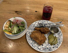 One of our favorites in Asheville, this place has a downtown location and this satellite location south of the city in a shopping center.  (EDIT: I just learned that while Tupelo Honey was founded in Asheville, it's grown into a chain with locations in fifteen states – we had no idea.)  We got their famous fried chicken with a side salad and blueberry lemonade.  Let's just say this was many steps up from Bojangles, but then again they're in a completely different kind of market.  Unfortunately, we let Savannah the Fox come in with us, and she swiped one of the two chicken legs before we could take the picture.  Shame on her.  Well, I guess I can't blame her: my companion said the chicken really was delicious, and I definitely enjoyed grazing on the side salad with a honey infused vinaigrette.