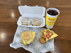 It seems we couldn't get out of Franklin without one more small run-around.  We went down the road to a Bojangles, but found the drive-thru line wrapped around the building.  As that Haywood Smokehouse was in the same shopping center, we got around the line and over there, only to find that they're not open on Sundays.  So, we went back to the Bojangles and prepared to wait rather than keep running around looking for anything better.  The store was relatively new and clean, but they definitely could have used an extra worker or two.  I kind of felt sorry for them, and we did our best to be patient.  My companion got a bacon-egg-and-cheese biscuit and said it was very good, I enjoyed an order of two Boberry Biscuits (blueberry infused biscuits with a frosting sauce poured over them), and we shared our last fountain Cheerwine for a while.