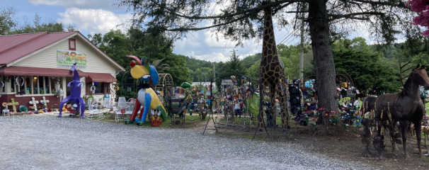 Our first stop back in Georgia was a place we'd heard about a few years ago but had never gotten around to visiting.  This place has those sheet metal animal figures that you see in other rural outdoor art places, only they have more than we've ever seen anywhere else.  Just about every common animal imaginable, including dinosaurs, dragons, unicorns, Sasquatches, gnomes, and other oddities.  (Our understanding of these things is that they're made by artisans in Mexico using old signs and other similar items, which they cut and reshape into these animal figures, then paint to complete the effect.)  My companion has a red fox in this style, and looked around for an opossum, but all they had were mean looking opossums with black bodies, which was not what he wanted.  It's interesting that they had a lot of rather large figures, more than a few with four digit prices, and most of those big ones looked like they'd been sitting out in the weather for a decade or more, leading one to wonder if anyone ever actually buys the big ones.  It also makes you wonder how much money the owner(s) have put into that place – quite a bit, even if you assume a fifty percent markup built into the prices.