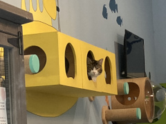 We had seen an ad for a shop on "Main Street" Williamsburg, called the Nautical Dog and Schwartzy's Cat Cove. My companion looked the place up and learned it had a room full of adoptable cats, and you could go in with them to interact with them. Well, we located the place to discover that "Main Street" is just an outdoor shopping mall, but a perfectly decent one. We walked around for a while, finding the Cat Cove and look around in the pet shop part of it. Ultimately, my companion decided not to go into the cat room, fearing it would be too hard to peel himself away, and it was definitely not the time or place to be considering a cat adoption. However, he was able to look in from the outside windows and get a number of pictures.