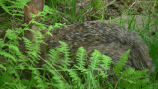 After a fried chicken lunch at the Big Meadows wayside (my companion had the chicken, while I partook of the collards and mac-and-cheese), we went just down the road a mile to a parking area beside the Appalachian Trail and hiked for about 2.75 miles to another parking area, then enjoyed a snack and some water before returning to the first parking area. Along the way back, we came across a rabbit on the trail, munching on leaves, so we stopped and got down on the ground, staying very quiet, and were able to watch him (or her) for nearly twenty minutes.