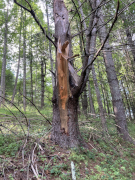 Along US 221 between Scottsville and Nathan's Creek is a state park set alongside the South Fork of the New River, which joins the North Fork and flows north east to Clayton Lake outside of Radford, Virginia (not far from Blacksburg). It eventually merges in West Virginia with the Gauley River to become the Kanawha River, which flows into the Ohio River along the Ohio border. This is the same New River that the famous New River gorge bridge crosses in West Virginia near Beckley. The river running beside the North Carolina park is nowhere near as deep and can be easily viewed from a riverside trail that runs a little over a mile, but there are other hiking trails away from the water's edge as well, including one that descends from the visitor's center up near US 221. We hiked that descending trail and then returned up it, having a much better appreciation for the altitude change between the two points. Tired and in no hurry, we took a nice, long rest break on the visitor's center's lovely back deck, and then we hit the road again around 7 PM.