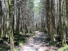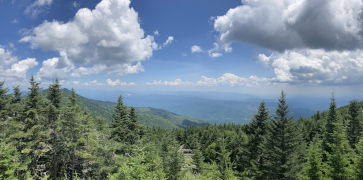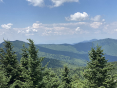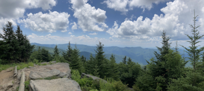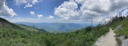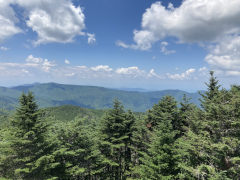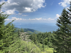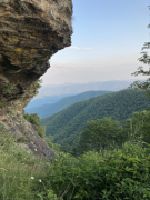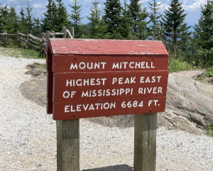 Mount Mitchell is the highest point not only in North Carolina, but the highest point in the continental United States east of the Mississippi River. The park is only accessible from the Blue Ridge Parkway via a mile and a half road at milepost 355.3. Along the way to the peak, you can stop off at the park's restaurant, which we saved for on our way out. We drove to the parking area and then took to the paved walkway, which is a deceiving concept: one tends to think that if a walkway is paved, it's going to be fairly easy to traverse. Not this one, for it's all uphill, and kind of steep. Even though it's only about half a mile to the top, that's one long, long half a mile. Still, the views were stunning today (last time we had fog and the temperatures were in the low 40's if not lower). We took it all in and got some pictures, then went back down to the parking area and looked through the little museum there. Then, my companion got his hiking gear and hiked out to Mount Craig, the second highest peak east of the Mississippi. He said the hike wasn't all that bad, perhaps even easier than getting to the top of Mount Mitchell in spite of this being a rocky backcountry trail of a little over a mile. On returning, we went down to that restaurant and had a late lunch before heading back to the Parkway.