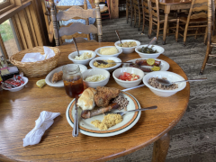 One of the biggest draws of the Dillard House property is its unique restaurant. It's not an all-you-care-to-eat restaurant, but the kind of place where they bring out a full southern meal in serving dishes and place it on the table for everyone to enjoy family style. There's plenty to go around and no one ever leaves hungry. We had lunch here and almost didn't need dinner later ... well, almost. The second picture below is the view from the front of the restaurant – even after all of those spectacular Shenandoah and Blue Ridge Mountain views we got to see, this one's pretty darn good, too.