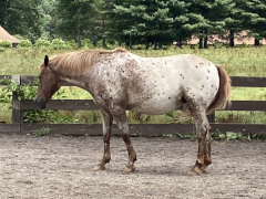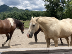 A separate business housed on the Dillard House grounds, the Dillard House Stables offers a variety of horseback rides, available to those staying on the property and outside guests. While I rested up in the room, my companion went on a one-and-a-half hour ride, which goes down into and through a river for a ways, the water getting up to the horses' bellies. He says it was quite an experience and that his guide was very personable with some interesting stories. Most of the pictures below are of the horses that were on their rest break, none of which were used on my companion's ride. The second to last picture is of his horse from atop it, and the last picture is of his guide (again, looking out from atop my companion's horse.)