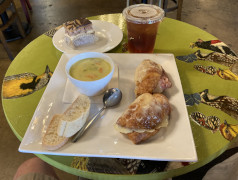 We returned to Amélie's one more time, this time to get a taste of the old days with a Croque Monsieur sandwich (that's a fancy ham-and-cheese), with the spinach-asparagus-leek soup and another caramel salted brownie torte (I wanted to try the garden stew, but they were out today). It was quite enjoyable, and in spite of asking for a glass for our thé glacé, they put it in a to-go cup, but I just kept that as a souvenir. We won't be back to Amélie's again this trip, but hopefully someday ... someday.