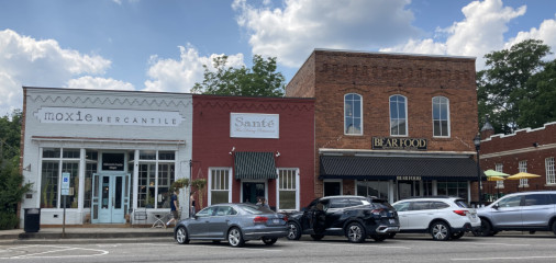As my companion and I have an affinity for smaller towns, we ventured fifteen miles east to Matthews to see what it was like. Unfortunately, my companion took a nasty fall on an odd double-step curb and skinned up his wrist, elbow, and knee, but he'll live, thank goodness – otherwise, I'd be in a lot of trouble. I include a couple of his pictures of the town below to try to make his fall worthwhile (he was taking the picture on the right when he fell).