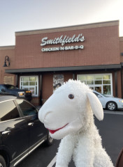After a hot day we stopped in another North Carolina chain fast-casual restaurant, Smithfield Chicken 'N' Bar-B-Q. As I was tired, I let my friend Savannah the Fox go in with my companion, and she was so taken by the barbecue chicken that she forgot to make sure my companion took a picture of the meal. Never send a fox in to do a sheep's work. Well, they told me that the food was pretty good – I'll have to take their word on that.