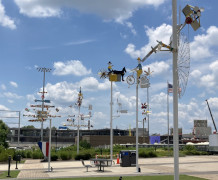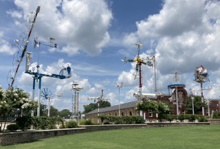 I'd dare say the highlight of our day was going through downtown Wilson, North Carolina this morning on a whim and discovering a park full of crazy wind-powered contraptions up on poles. Color me impressed that my companion knew off the top of his head that they were "whirlygigs". We found a sign that explained that a local man named Vollis Simpson made all of these whirlygigs and displayed them on his farm, but as he got older he couldn't maintain them, even though people were coming from all around to see them. So locals got together and raised money to build this park and to carefully restore and maintain his many creations so that they can continue to "fly" in the park year after year. It is definitely a sight to behold, and somehow still pictures just can't do it justice.
