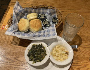 So, sorry to burst anyone's bubble, but as you might expect from the start of this post, we aren't going to bend over backwards to eat every meal at a North Carolina based restaurant. Trust me, we'd like to do that, but it's hard to find decent locally run restaurants in every place we visit. Tonight, we ended up at Cracker Barrel, which has really lost its appeal as a chain. For probably the third time in the last few years, we were asked to wait for twenty minutes because of a "kitchen hold". Why they can't properly staff their kitchens anymore is beyond me. Since we had lunch late, the wait wasn't such a big deal, but then once seated we were informed that they had no lemonade, and no salad dressings other than blue cheese. We ended up getting a caffeine-free soda, a bowl of turnip greens, a bowl of mac-and-cheese, and an order of biscuits. On the upside, the food we got was good, and the waitress gave us a discount, but overall they made a lousy impression on us. Have to wonder if this chain is destined to go the way of so many other well-known brands that have up and disappeared over the years …