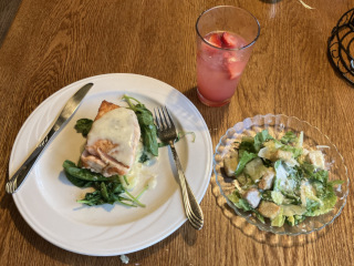 We got to dinner after eight o'clock again tonight, but the upside to eating late is that there's no crowds. We got a window seat again, though someone was having a birthday party right outside the window, down around a park picnic table. Still, we enjoyed our dinner: my companion had the salmon dish with mashed potatoes and wilted spinich leaves, while I enjoyed grazing on the caeser salad. Afterward, we split an absolutely delicious cheesecake. (Full disclaimer: I had some of the salad before we took the picture: what they served was nearly twice what you see: enough to nearly overflow the plate.)
