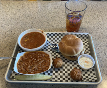 We made it to Mount Airy, albeit a bit late, and went down the street to Arby's for a quick dinner. Not a North Carolina specialty, but my companion likes it for a quick and simple meal when nothing else sounds all that good at the moment. He went with his usual: a beef and cheddar, add lettuce and tomato to make it healthy, with curly fries and an apple turnover. Not sure I call it all that healthy, but at least he had something to eat.