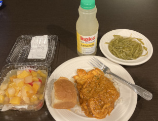 Okay, I'm stretching this one a little bit, but what choice do I have when my companion buys dinner at a grocery store. But, we had a suite room for the night, and he didn't want to fool with going out for dinner. And, Ingles is a North Carolina grocery chain, based in Black Mountain, which is just east of Asheville (we actually went through the town on the way to Asheville from Catawba Falls). What you see is a chicken tikka masala with vegetarian based chicken, plus green beans, fruit cocktail, a roll, and lemonade. Honestly, it's a better meal than a number of our lesser restaurant finds, and I understand his wanting to wind down early when he has to be at an IT conference early tomorrow.