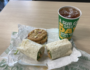 Subway does tend to be my companion's go-to-in-a-pinch restaurant. This time he tried a chicken salad wrap, having them put their special chipolte sauce on it. He said it was pretty good. I just ate one of his raspberry cookies.