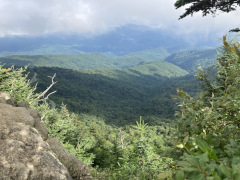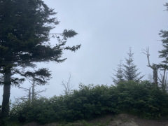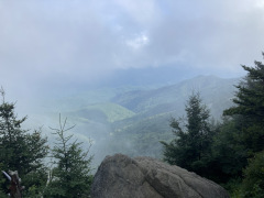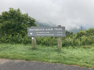 Our last Blue Ridge Parkway hike for this trip, we stopped at the last visitor's center and followed the rather steep trail all the way to the peak of Waterrock Knob. Let me emphasize 'steep' – even the lower part that is paved is quite steep, which might be surprising to visitors who'd expect a paved trail to be for everyday people. From that lower view point there's a natural trail that goes on up to the peak. We got there and there was fog everywhere, but we had plenty of time, so we hung around and the fog started to clear – not completely, but enough that we got to see some great views and get some good pictures, too. The three pictures on the second row below show the progression of fog clearing. The last picture on the first row shows the Blue Ridge Parkway in the distance below us. We finally went back down to find it had been raining below us, and was still lightly raining in the parking lot.