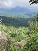 Every long trip is going to have it's good days, its bad days, and its mediocre days. I'll classify this one as just below mediocre. We had a rough time coming down off the Parkway into Brevard to detour the closed section of the Parkway. Besides being a winding descent, there was heavy traffic and cyclists in the way (cyclists wonder why people don't want to support cycling, but when they refuse to move over into one of a dozen paved pull-overs and instead insist on slowing up traffic on a winding mountain road, well, that's why.). Then, we had a rough time finding someplace to eat. We finally got fed, but forgot to get gas, which made things a little nerve wracking as we were heading back up onto the Parkway (we had 70 miles-to-empty, but I wasn't so sure about how quickly we'd find a station along the Parkway, though my companion insisted we only had something like 40 miles to the end near Cherokee. We got to the Parkway and found it covered in moderate fog, but we made the most of it and got a few patches of clearer weather, and I felt a lot better after we detoured down towards Waynesville to fill up the tank. After that, we did a rather strenuous hike, found thick fog at the top, but hung around and the fog cleared enough to get to enjoy a pretty decent view. After that, it was all downhill, with rain the rest of the way into Cherokee, so we didn't get to watch a sunset as we'd hoped. We got to our hotel in Franklin, North Carolina so late that we just grabbed some food from the Ingles next door and ate in the hotel.