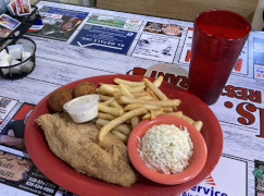I love little family run restaurants that look like they've been around for half a century or more, and this one fit the bill perfectly. It was so small that there was no place to wait inside, so you wait out on the patio until they can seat you. We got here at nearly two o'clock on a Friday, expecting they would be well past their lunch rush, but we still had to wait about ten minutes due to a full dining room. My companion got the catfish special and said the fish was delicious, while I ate on the fries and coleslaw and found them both to be nicely done, and the iced tea was near perfect, too. The only problem was that it was so filling that once again we had no room for dessert, which may be just as well, as we were completely torn between the key lime pie and the lemon pie.