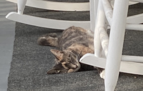 The upside to bed and breakfast inns is that your room comes with a fresh cooked breakfast in the morning. The downside is that breakfast is usually at nine in the morning, if not earlier – not fun for self-avowed night owls like my companion. But, he's willing to make do with the inconvenience for a place as nice as this one. The inn is an 1800's Victorian house set in the middle of downtown Blue Ridge, putting the downtown shops within easy walking distance. Views out the back include the Blue Ridge Scenic Railroad, which does tours up to McCaysville on the Tennessee border. All that said, my companion's favorite feature of the inn is Blue the cat, who roams around the outside, going from the front porch to the back porch. On his first visits, my companion found Blue to be a bit aloof, like so many cats, but Blue has warmed up to him and will now come nap in his lap as he sits on a front porch rocker. That's fine and well, but I ask, what can a cat give you that a sheep can't? Anyhow, we were unfortunately so tired when we went down to breakfast that neither of us thought to take a picture of the food, but we'll do our best to remember tomorrow.