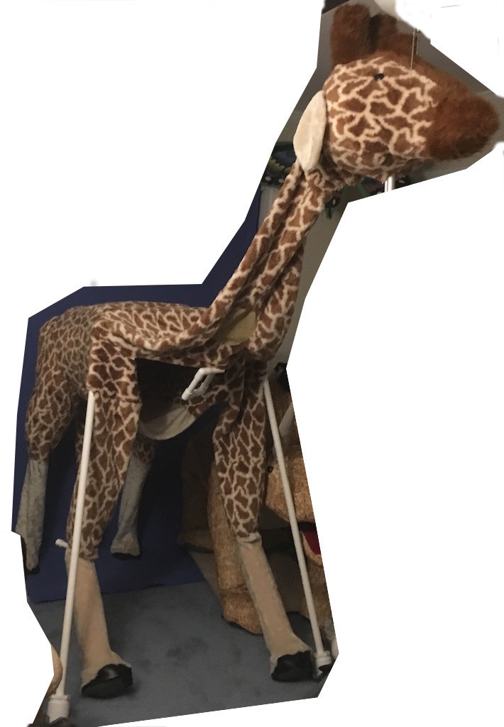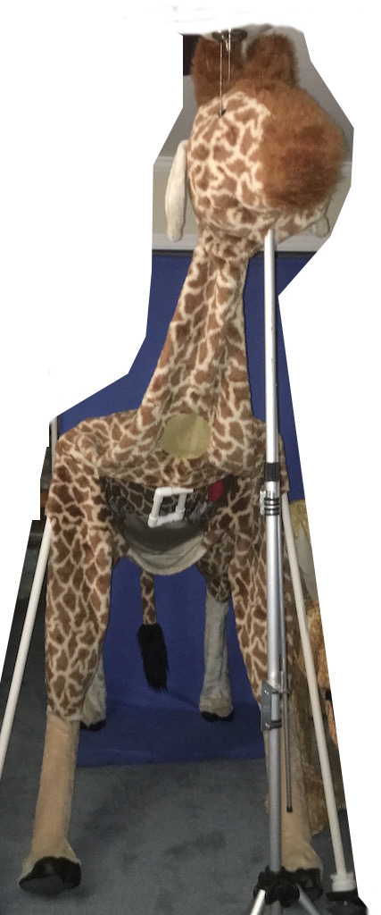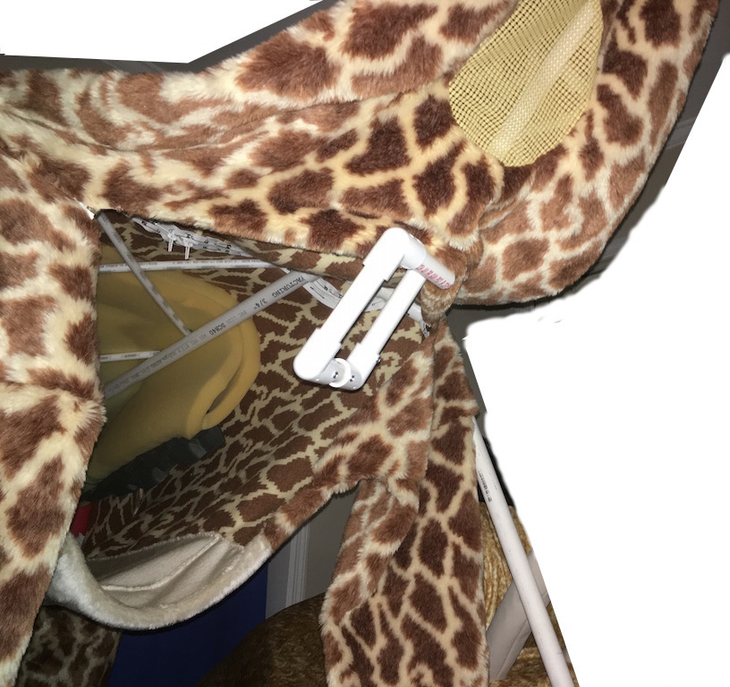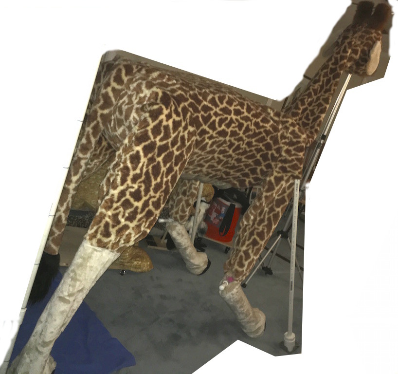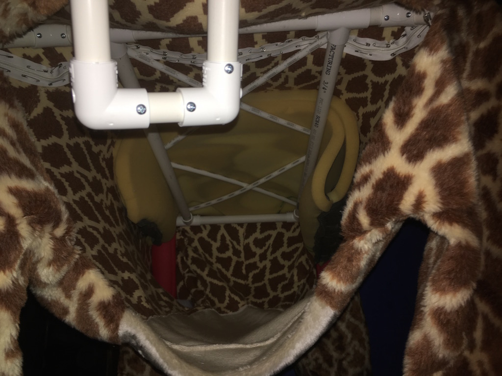Front legs were going to be raised up by 6 to 9 inches (by extending the front support poles) to get proper giraffe posture, but this was never done due to the 8' ceilings in my living room. However, it would be easy enough to buy PVC pipe parts to make that change if desired.