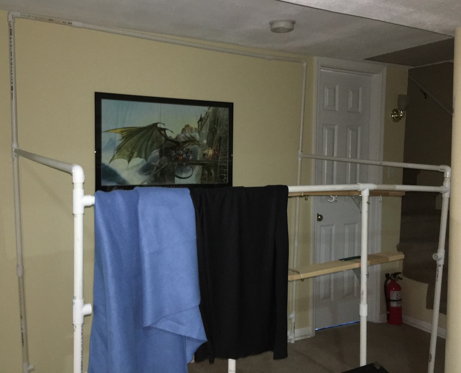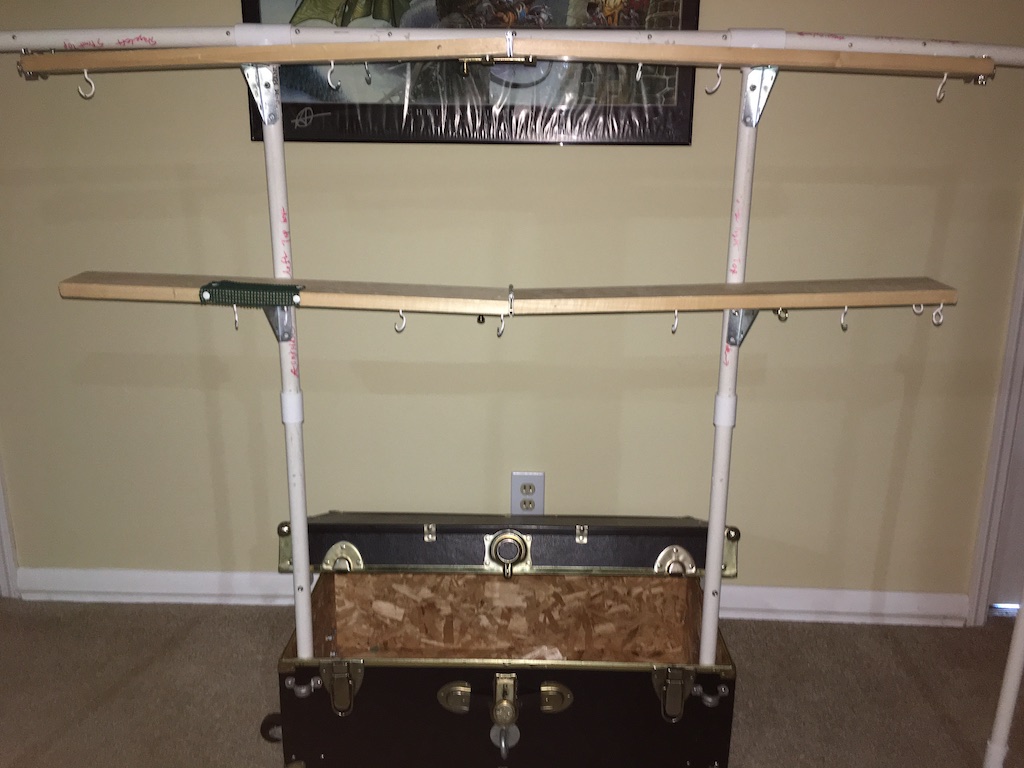 This is stage I custom built to use for my staged half-hour shows back in the mid-2000s, but it proved to be a little too complicated for solo performance use. It might be fine for you, though, if you have a couple of people to help you set up and break down your shows when traveling. It could also be a great practice stage that you keep assembled in a basement or workroom at home. If you're handy with tools, it would be easy to replace a few of the PVC pipes to raise or lower the stage height, or make other adjustments as desired.