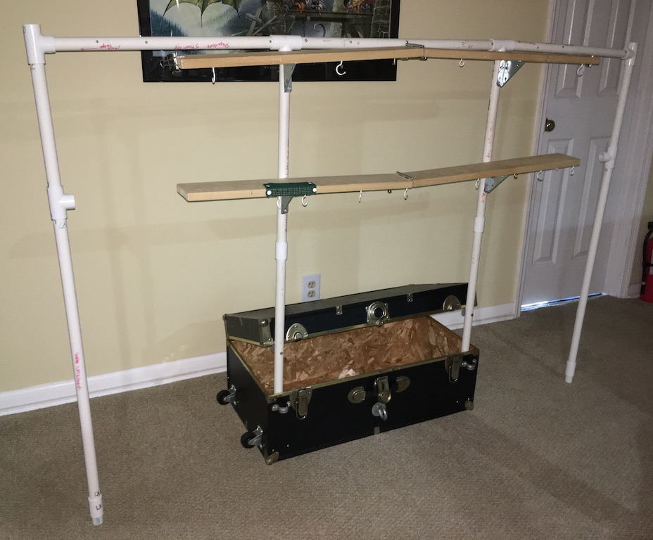 Stage is built from 3/4" PVC pipe supported by the travel trunk. All parts (PVC, shelves, and curtains) fit into the trunk for transport, except the two long side poles and the long pole at the top of the backdrop area. For stability reasons, I didn't feel comfortable cutting those poles down into smaller pieces.