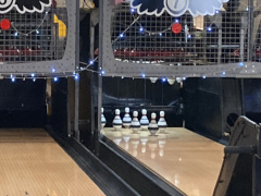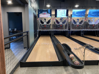 My companion had always wanted to try duckpin bowling, and lo and behold there was a small entertainment center on the Tennessee side of State Street offering this unusual 'sport'. In duckpin bowling, the balls are smaller than standard bowling balls, the pins are shorter as well, and in the places where we've seen duckpin setups, the automatic setters utilize filaments tied to the tops of the pins to lift them up and set them down neatly in the standard triangular configuration. My companion did two games and found it interestingly unique compared to regular bowling, and surprisingly he didn't do all that bad once he got used to how lightweight the balls are.