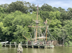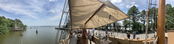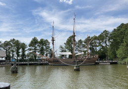 We arrived at the Jamestown Settlement about two in the afternoon and had three hours to explore it, which was just about right, though we had no time to go over to the historic site (both closed at 5 PM daily). If you can get their earlier and see both, that would be ideal, as I'm sure it would be interesting to put what you see at the Settlement site in true historic (and geographic) perspective. As it was, we enjoyed what we saw at the settlement, starting out in the museum, which is huge. From there, we went outside and hiked down to the Powhatan village, exploring the recreated huts and watching some costumed interpreters presenting examples of native daily work life. From there we went down to the docks, where they have recreations of the Discovery, Godspeed, and Susan Constant, albeit the latter was out that day, being refurbished by a New England boat builder. We went onboard one of the other two and got a close-up look at just how cramped the conditions were for such a long voyage across from Spain. We then went into the fort and explored the various buildings there before returning to the museum and heading out just before they closed at five.