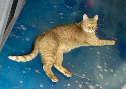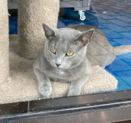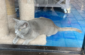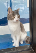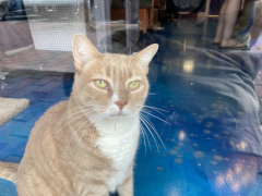 We had seen an ad for a shop on "Main Street" Williamsburg, called the Nautical Dog and Schwartzy's Cat Cove. My companion looked the place up and learned it had a room full of adoptable cats, and you could go in with them to interact with them. Well, we located the place to discover that "Main Street" is just an outdoor shopping mall, but a perfectly decent one. We walked around for a while, finding the Cat Cove and look around in the pet shop part of it. Ultimately, my companion decided not to go into the cat room, fearing it would be too hard to peel himself away, and it was definitely not the time or place to be considering a cat adoption. However, he was able to look in from the outside windows and get a number of pictures.