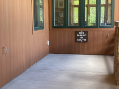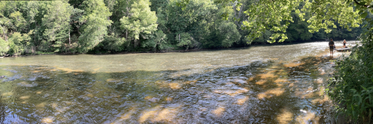 Along US 221 between Scottsville and Nathan's Creek is a state park set alongside the South Fork of the New River, which joins the North Fork and flows north east to Clayton Lake outside of Radford, Virginia (not far from Blacksburg). It eventually merges in West Virginia with the Gauley River to become the Kanawha River, which flows into the Ohio River along the Ohio border. This is the same New River that the famous New River gorge bridge crosses in West Virginia near Beckley. The river running beside the North Carolina park is nowhere near as deep and can be easily viewed from a riverside trail that runs a little over a mile, but there are other hiking trails away from the water's edge as well, including one that descends from the visitor's center up near US 221. We hiked that descending trail and then returned up it, having a much better appreciation for the altitude change between the two points. Tired and in no hurry, we took a nice, long rest break on the visitor's center's lovely back deck, and then we hit the road again around 7 PM.