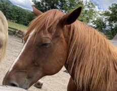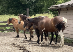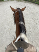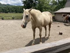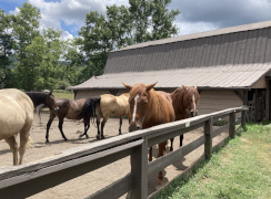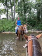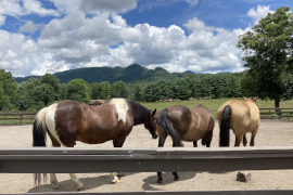 A separate business housed on the Dillard House grounds, the Dillard House Stables offers a variety of horseback rides, available to those staying on the property and outside guests. While I rested up in the room, my companion went on a one-and-a-half hour ride, which goes down into and through a river for a ways, the water getting up to the horses' bellies. He says it was quite an experience and that his guide was very personable with some interesting stories. Most of the pictures below are of the horses that were on their rest break, none of which were used on my companion's ride. The second to last picture is of his horse from atop it, and the last picture is of his guide (again, looking out from atop my companion's horse.)